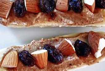 Tartiner sur la banane coupée en deux dans la longueur puis décorer avec des raisins et des amandes coupées en deux.