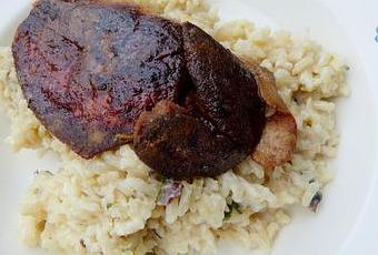 Le fois gras frais est extrait de son enveloppe plastique puis coupé en escalopes d'un centimètre de large. Fariner légèrement chaque tranche et les placer une dizaine de minutes au congélateur. Chauffer la poêle - par exemple, celle des champignons - et faire cuire une à deux minutes les escalopes de fois gras sur chaque face. Evacuer la graisse de cuisson. Disposer le rizotto dans des assiettes creuses et les escalopes de foie bien grillées par dessus.