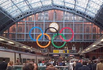 Après 2h20 de voyage en Eurostar dont 20 minutes sous la Manche (le plus dur, c'est de porter le masque et le tuba durant le passage sous le tunnel comme l'exigent les consignes de sécurité), me voici arrivé à Londres. Avec ces anneaux olympiques, je suis tout de suite dans l'ambiance des Jeux !