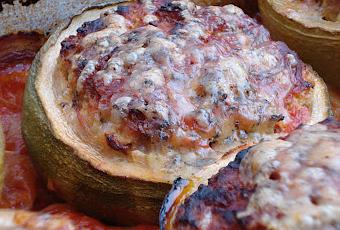 Ce samedi soir, j'ai donc préparé trois de ces jolies cucurbitacées en les garnissant d'une farce allégée composée de farce traditionnelle mélangée à son poids en protéines de soja réhydratées, un œuf et un peu de son d'avoine. Le tout déposé sur la chair des courgettes mélangée à un peu de coulis de tomates et gratiné avec un reste de fromage bio aux orties qui se baladait pas là.