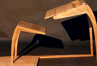 Le pupitre d’écolier, image évocatrice pour certains d’un sentiment de nostalgie, pour d’autres, plutôt cauchemardesque, a marqué de sa plume les générations. Il se veut cependant revisité, détaché de tout rationalisme. Destiné à l’adulte, le pupitre raconte l’histoire d’un retour aux sources, à l’essentiel. L’acte de matérialiser l’ombre portée consiste à donner vie au mobilier, elle est l’image d’un double, d’une âme. Le pupitre dessine l’ombre portée tandis que celle ci assure son maintien. »
