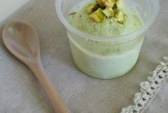 Soit vous versez dans la sorbetière et vous laissez turbiner pendant 25 à 30 minutes en incorporant les pistaches concassées 5 minutes avant la fin et versez dans un récipient adapté avant de réservez au congélateur quelques heures.