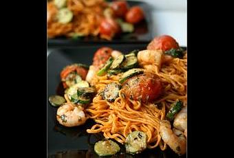 - Faire revenir les crevettes, les courgettes et les tomates cerises dans l'huile d'olive, l'ail et le basilic.