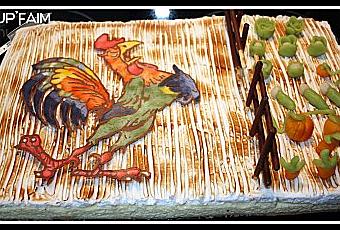 Le coq est fait en Window color, méthode que vous trouverez ici, je n'ai rien changer puisqu'il n'y a rien a y changer ! Par contre je préciserai qu'il est nettement mieux d'utiliser des colorant en poudre, car avec le même colorant vous pouvez aussi teindre du chocolat blanc... j'ajouterais aussi que pour moi il est plus facile de faire tout le décor en glaçage royal, y compris les pourtours qui sont plus vite fait, et du colorant brun tout le monde à cela dans ses placards (cacao)....