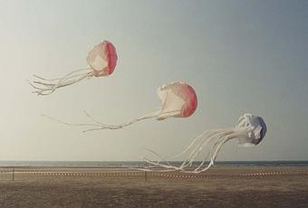 L'exposition "Au dessus des vents" présente des projections et de grands clichés aux tons pastels représentant des cerfs volants inspirés de créatures aquatiques photographiées sur les immenses plages du Nord.