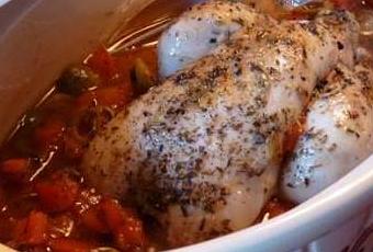 Imaginez de beaux coquelets, bien dodus, tout dorés, placés au coeur de ce plat en terre. Ils sont entourés d’olives vertes finement émincées, de belles tomates, d’ail et d’oignons grelot. Ajoutons à cela, une sauce magnifiquement parfumée d’herbes de Provence et de Porto. Ca y est, vous sentez tous les parfums qui s’en dégagent et qui embaument déjà toute la cuisine.