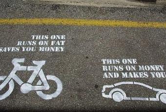 Cette maxime est un vrai challenge de traduction, mais disons que le vélo brûle des graisses et économise des sous, alors que la voiture brûle les sous et économise la graisse.