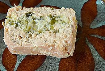 Je n'ai pas pris le temps de photographier la terrine en entier mais j'en ai sauvé une part. Il faisait chaud, un soir de fin juillet avant les orages. J'ai donc servi simplement cette terrine (inspirée de chez Cojocano) délicieuse, bien fraîche, en plat principal. Vous pouvez la servir avec une sauce au yaourt et au citron.