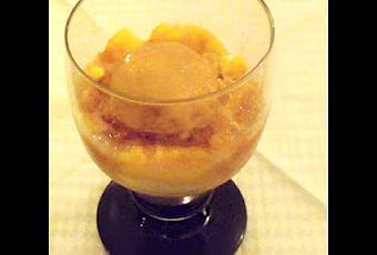 A l’avance : a/ Vous prévoyez des coupes avec des lamelles de pêches posées sur le fond . b/ Vous prévoyez de râcler à la fourchette la purée d’abricot devenue dure, pour avoir une texture granitée et aérée, que vous remettez au congel jusqu’au moment du dessert.