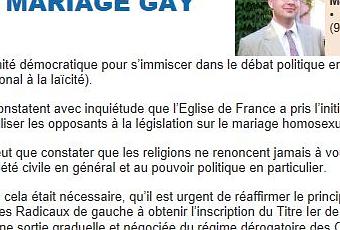 L’Eglise catholique vient de donner une consigne nationale à ses évêques pour que le 15 aout, soit lu dans chaque église, une texte destiné aux fidèles, et au-delà, au nouvel exécutif et à la majorité de gauche, afin de faire entendre la position de cette religion, sur les réformes sociétales que le Gouvernement prépare pour 2013. Cependant, la hierarchie catholique oublie un peu vite qu’elle n’a pas à intervenir dans le domaine public et politique. Les religions, leur pratique et leurs messages sont du domaine privé et doivent y demeurer. C’est dans ce cadre, celui de la laïcité, que la République est amenée à respecter chacune d’elle. Mais, elle ne doit pas accepeter qu’elles outrepassent ce cadre et qu’elles tentent de penetrer dans le champ politique.
