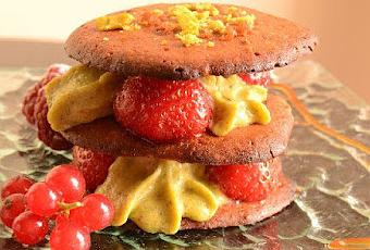 Ingrédients (pour 4 pers.) chantilly 20cl de crème liquide entière 80g de sucre glace 80g de pistaches en poudre palets 2 blancs d'oeufs 50g de beurre 50g de farine 100g de pralin