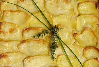 Peler les pommes de terre. En couper deux ou trois selon taille, en très fines lamelles à l’aide d’une mandoline et les réserver. Couper le reste en morceaux et les cuire soit à l’eau bouillante soit à la vapeur jusqu’à ce qu’elles soient bien tendres. Les égoutter.