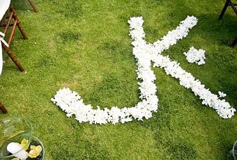 une décoration d’allée ace un monogramme créé a l’aide fleurs artificielles