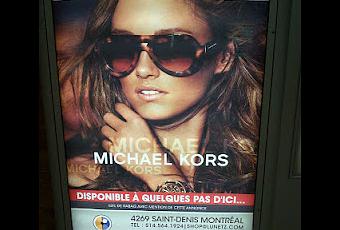 - Le produit phare : Lunetz a certainement attiré l'attention de plusieurs utilisateurs de métro en mettant en avant un produit très approprié en saison estivale (des lunettes de soleil). Par ailleurs, vous savez peut-être que la marque Micheal Kors fait un tabac en ce moment à Montréal. De plus en plus d'utilisatrices de transport en commun s'affichent avec des sacs à main, ballerines etc. à l'effigie de la marque (le fameux MK).