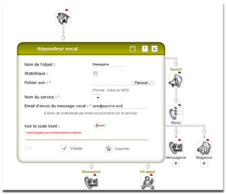 Pour simplifier le développement, Sibilo Studio présente une interface non technique, adaptée aux superviseurs de plateaux des centres d'appels. Ces derniers pourront donc aussi bien modifier que créer un scénario de service vocal, sans toucher une ligne de code, l'application se charge de générer le VXML correspondant.