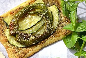 - Sortir les rectangles de pâte du four et les tartiner généreusement de pesto. Disposer quelques lamelles de courgette puis 2 moitiés de piment doux sur le dessus. Saler et poivrer.
