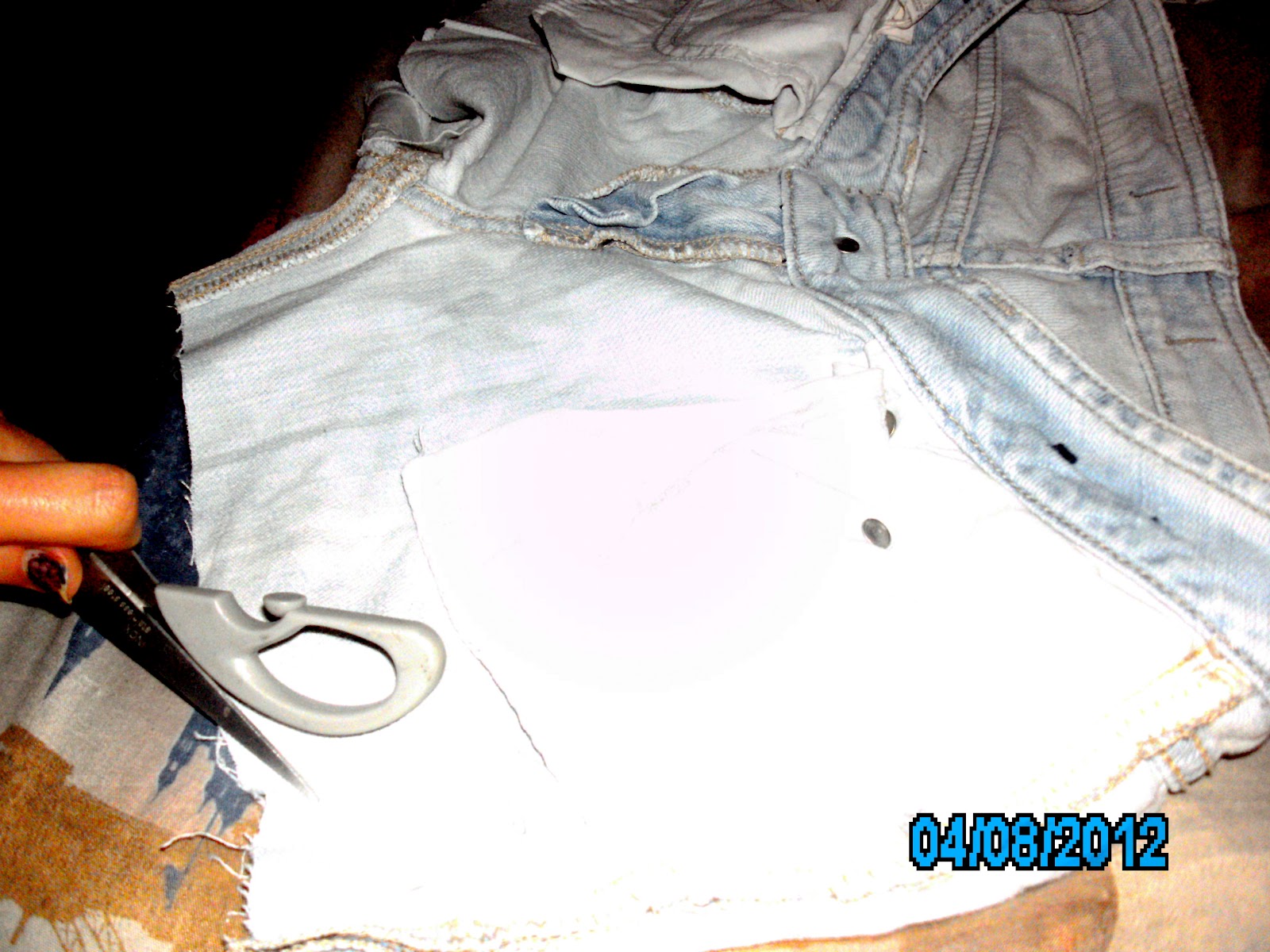 On prend l'autre côté du short et on le tourne pour voir les couture enfaîte! Je prend un ciseau (ou un cutter, c'est plus facile) et je m'amuse à créer des petits fils en bas du short en frottant le ciseaux contre le short. Je trouve que ça donne un beau effet!Dernière étape: Je prend de la peinture blanche pour textile. Je fais deux petites étoiles (pour le plaisir) sur la poche!