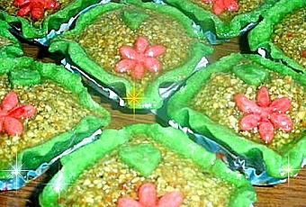 préparer la pâte en ajoutant le colorant vert, en laissant une petite boule (grosseur d'une noix) pour la colorer en rouge pour les fleurs.