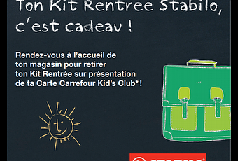 Le samedi 8 septembre 2012, tous les enfants agés de 3 à 12 ans se présentant à l'accueil de leur magasin carrefour avec la carte Carrefour Kid's club* se verront remettre un kit rentrée "Stabilo".