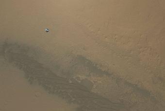 Sur cette autre image réalisée depuis l’espace par la caméra HiRISE de la sonde spaitale Mars Reconnaissance Orbiter (MRO), on distingue les « carcasses » — à jamais abandonnées — des différents éléments qui ont permis l’amarssissage en douceur de Curiosity : le bouclier thermique, le parachute et la grue aéroportée Sky Crane. Ce dernier s’est échoué à environ 650 mètres du rover, selon les estimations des ingénieurs de la mission.
