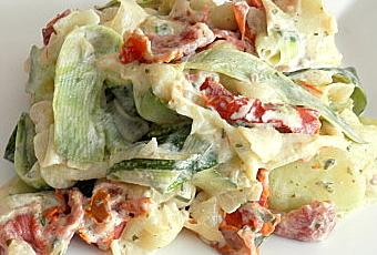 Aujourd'hui, je vous propose une garniture de légumes très sympa : des Tagliatelles de courgette aux tomates séchées et ail et fines herbes. Elle se marie très bien avec des grillades...