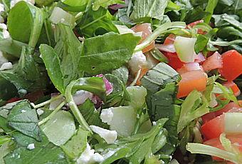 Sur une planche coupez en cubes de 1 cm tous les légumes et la feta en même temps à la mezzaluna ou avec un couteau éminceur.