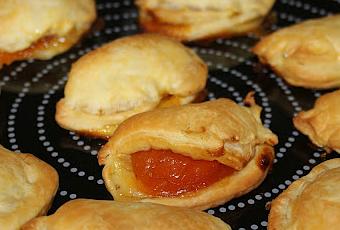 Faites 9 ronds dans la pâte, légèrement ovales.poser une cuillère à soupe de votre confiture d'abricots au centre puis refermer le rond sur lui même.