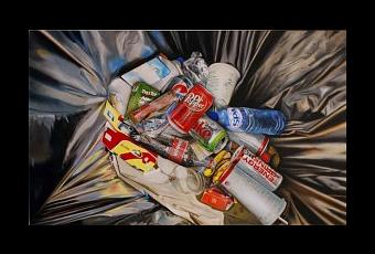 Cet artiste d’origine française se décrit comme un artiste contemplatif de notre monde. Peintre hyper réaliste, il dénonce la société de consommation éternellement insatiable en mettant en scène des produits divers de consommations courantes et nous propose en peinture un rendu très concret de nos poubelles !