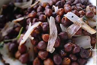 ajouter l'oignon émincé et les piments épépinés et couper en morceaux assez petits.Ajouter les grains secs et les feuilles de cari poulé et chauffer pendant 5 minutes.