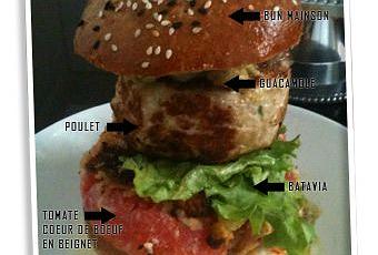 Imaginez... un pain fait maison fondant, une belle tranche de tomate coeur de boeuf en beignet, un steak de poulet gouteux, de la salade, et surtout un guacamole maison riche en goût pour réhausser le tout. Le voilà : le guacamole burger. A servir avec un délicieux coleslaw maison.