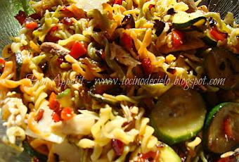 Dejar templar un poco y añadir las verduras a la pasta. Mezclar bien.