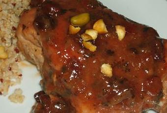 Bref, je feuillète, je feuillète et je fini par tomber sur une photo qui m'a donnée faim : le poulet aux pistaches et aux raisins secs ! Ouaiiiis ! ça a l'air bon ça dis donc ! C'est tout doré et tout caramélisé sur la photo, miam !