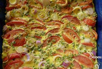 Dans le fond du plat, disposer les tomates coupées en quartiers.Disposer au dessus les oignons en rondelles.Verser le flan.Four 180°C pendant 35 minutes.