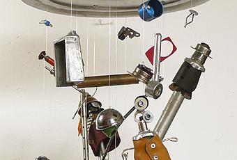 Ovni Carillon Mobile #3 : Réalisé à partir de pièces métalliques de plomberie, de machines à coudre, de rivets, de morceaux de cuir, de fil de pêche doublé ou quadruplé pour la suspension des pièces... En lançant la soucoupe volante, les fils s'enroulent et relancent dans l'autre sens la soucoupe. Le carillon produit 6 sons différents. Page des créations disponibles.