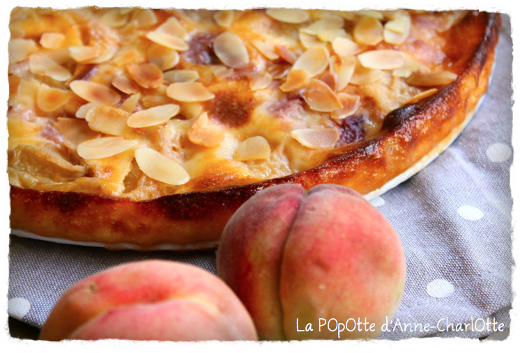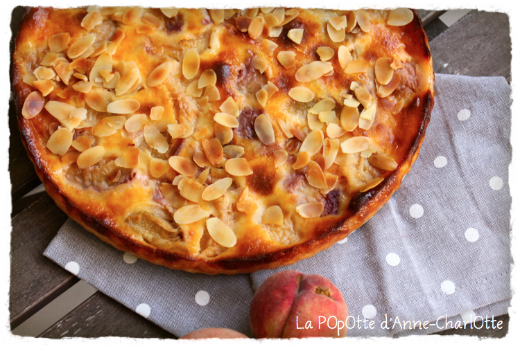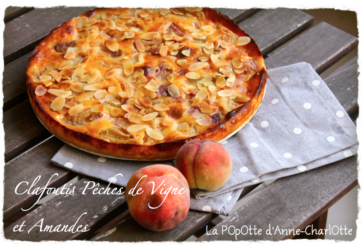 Ingrédients pour 8 personnes : - 6 pêches de vigne- 150g de sucre en poudre- 60g de Maïzena- 25g de beurre demi-sel- 25cl de crème liquide entière- 25cl de lait- 2 oeufs entiers + 2 jaunes- 1 poignée d'amandes effilées Préchauffer le four à 200°. Dénoyauter les pêches de vigne et les couper en quartiers. Dans une poêle anti-adhésive, faire fondre le beurre et ajouter les pêches et 50g de sucre. Laisser mijoter quelques minutes et réserver. Dans une jatte, délayer la Maïzena dans le lait. Dans un autre récipient, fouetter énergiquement les oeufs + jaunes et 100g de sucre jusqu'à ce que le mélange blanchisse. Ajouter le lait puis le mélange lait-Maïzena. Enfourner une vingtaine de minutes et y ajouter les amandes légèrement torréfiées dans une poêle bien chaude. Poursuivre la cuisson environ 5 minutes le temps que le clafoutis soit bien doré.Servir bien frais !