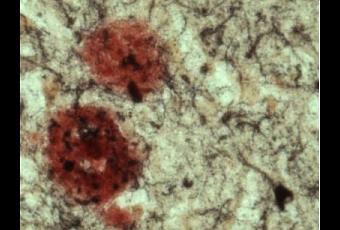 Source: The Journal of Neuroscience 15 August 2012, 32(33):11390-11395; doi:10.1523/JNEUROSCI.0757-12.2012 Alzheimer's β-Secretase (BACE1) Regulates the cAMP/PKA/CREB Pathway Independently of β-Amyloid (Visuel @ Sanford-Burnham Medical Research Institute « Plaques béta-amyloïdes (rouge) dans le cerveau d'un patient atteint de la maladie d'Alzheimer »).