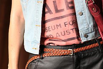 Tee-shirt femme col V coton flammé print lettrage (en vente sur Somewhere) – sandales (ancienne collection) – veste en jean vintage – jupe enduite – sac en cuir bordeaux
