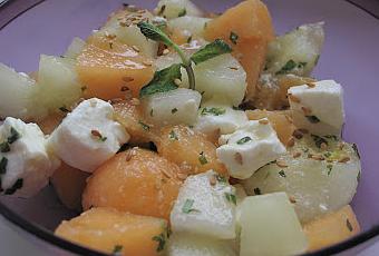 1: Coupez les melons en dés, ou si vous possédez une cuillère à melon, formez des billes.