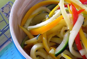 Pour 2 personnes 3 tasses de lanières de poivrons multicolores1 courgette verte régulière et 1 courgette jaune1 gousse d'ailUn morceau de gingembre (de la taille d'une gousse d'ail)2 cuillère à café de sauge finement ciseléeUne pointe de couteau de paprika fuméFleur de sel2 cuillères à soupe d'huile d'olive Faire de fines lanières de poivron et les mettre dans un cul de poule assez grand. A l'aide d'une mandoline, faire des tranches de courgette (fines mais pas trop) dans la longueur. Puis au couteau, faire des spaghettis et les ajouter aux lanières de poivron. Ajouter la gousse d'ail hachée, la sauge ciselée, le paprika, la fleur de sel et l'huile d'olive. Mélanger avec les mains pour assouplir l'ensemble et servir ou réserver au frais.