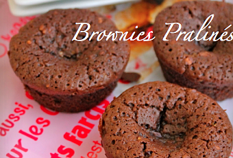 Faire fondre le chocolat et le beurre à feu doux dans une casserole. Mélanger jusqu'à obtenir un mélange homogène.Dans une jatte, fouetter énergiquement les oeufs entiers et le sucre jusqu'à ce que le mélange blanchisse. Ajouter la farine en pluie et la levure, puis le mélange beurre chocolat. Terminer en ajoutant le pralin. Verser la préparation des moules à muffins en silicone. Enfourner 15 minutes et poursuivre la cuisson si besoin.Attention : les brownies doivent être encore fondants à l'intérieur.L'Astuce de la POpOtte : Remplacer le pralin par deux c. à soupe de... Nutella ! L'Accord Met/Vin d la POpOtte : un Crémant du Jura