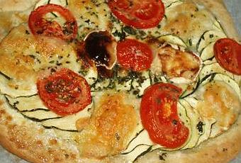 Couper les courgettes et les tomates en rondelles. Les poser sur la pizza.