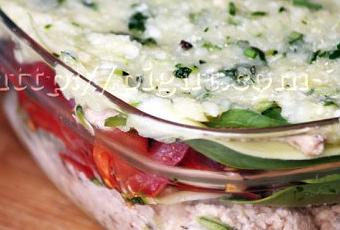 Continuer en déposant la sauce tomate, puis enchaîner en mettant deux couches de courgette (ou une grande lamelle pliée en deux) et une couche d’épinards.