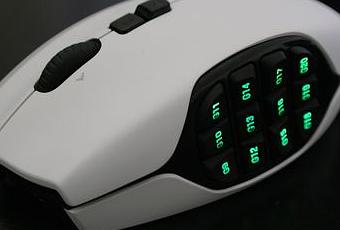 Commençons avec la partie visible de la souris : le design. La G600 de Logitech arbore une robe noire ou blanche, c’est au choix, en plastique mat assez agréable au toucher. Sachez que si vous optez pour le blanc, vous devrez vous confronter, au bout de quelques semaines, aux traces qui s’incrustent dans les grains de la matière, et c’est un peu dommage. Sur le côté gauche, la robe de la souris « s’ouvre » pour laisser apparaître les 12 boutons de tranche, ceux-là mêmes qui la caractérisent comme une souris MMO. Ces derniers, très resserrés, arborent des formes différentes selon les lignes où ils sont placés, ce qui est censé donner une meilleure reconnaissance aux doigts. Ces derniers sont numérotés et surtout rétro éclairés par des LED qui vous donnent le choix entre 16 millions de teintes.