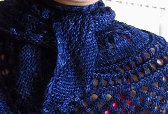Il m'a été offert par une amie, et je ne cesse de m'émerveiller en le regardant. La qualité de la laine utilisée (malabrigo sock), la couleur bleue profonde et dégradée, les points ajourés : Ce châle est une pure merveille!!!