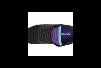 Les sneakers ont une empeigne en daim noir contrasté par des touches de violet et de turquoise avec une semelle externe blanche.