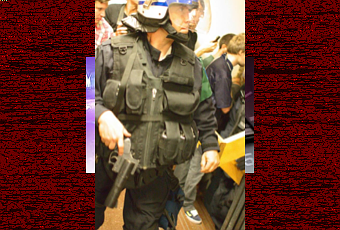 Bien que les tensions sont vives à l’UQAM nous sommes en droit de nous demander pourquoi le policier à une arme à la main alors que nous voyons en arrière plan des étudiants marchant calmement dans les escaliers.