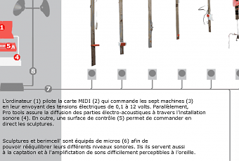 Mécaphonies#3 constitue une évolution du deuxième dispositif, avec bérimcell', présenté aux Instants Chavirés à Montreuil (93). La possibilité nous a été offerte d'approfondir le travail de sonorisation des sculptures à l'occasion d'une résidence au studio Césaré à Reims. Il s'agissait d'adapter le dispositif à un lieu tel que le cirque du Manège de Reims (un des cirques d'hivers du XIXe siècle les mieux préservés).
