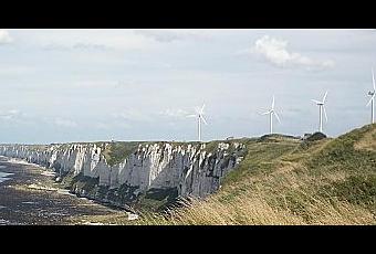 Il est un argument que je ne vois jamais (mais mea culpa sans doute) dans les débats sur le nucléaire : c’est celui de l’emprise au sol. Quelle surface de paysages altère-t-on par des éoliennes, comparé à une centrale nucléaire ? Je suis ce jour à Fécamp, où déjà quatre à cinq éoliennes sont au droit des fameuses falaises de craie (photo), et où un des quatre à cinq projets d‘éolien offshore (appel d’offres gouvernemental de 2011) verra le jour d’ici 2015 (83 éoliennes de 6MW chacune, superficie au large de 75 km²). J’ai essayé de comparer les superficies, à puissance donnée.