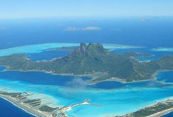 Un collier de corail protège Bora-Bora comme une digue. Il s'agit d'un récif-barrière, qui ne présente qu'une ouverture sur l'océan : la passe de Teavanui, située à l'ouest de l'île principale, qui permet à la plupart des gros cargos d'entrer dans le lagon. Ils doivent, toutefois, rester dans un chenal car ailleurs l'eau est peu profonde. Le récif-barrière est par endroit très large, il dépasse deux kilomètres de largeur au sud-ouest de l'île. À l'est et au nord de l'île, le récif supporte une série d'îlots constitués de débris coralliens et de sable (ce genre d'îlot est appelé motu). C'est sur un motu situé au nord, le Motu Mute, qu'a été construit l'aéroport de Bora-Bora.