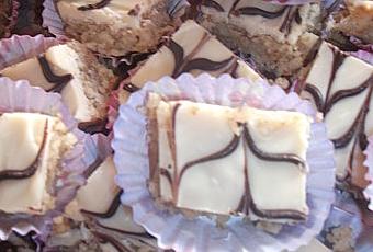 2 Sur la pâte encore chaude, couler 250 g de chocolat blanc préalablement fondu au-dessus d'un bain-marie. Tracer le marbrage au chocolat noir. Mettre au réfrigérateur jusqu'à durcissement complet des chocolats. Retourner la plaque sur un film alimentaire et refaire ainsi sur l'autre face. Le nappage au chocolat blanc de cette 2ème face doit se faire rapidement à la spatule car par l'action du froid, il durcit rapidement. Pour le marbrage, vous pouvez choisir de ne marbrer qu'une seule face, choisissez alors la 2ème face(celle du dessous qui deviendra la face supérieure). Remettre à durcir au réfrigérateur et couper en petits losanges d'environ 4 cm. On peut les conserver dans une boîte hermétique au réfrigérateur pendant plusieurs semaines, il suffit de les sortir quelques heures avant pour la dégustation. Pour le marbrage, étaler la couverture blanche, tracer à la douille les lignes horizontales de couverture noire. Ensuite tracer à la pointe du couteau des traits verticaux, en alternant les sens de passage de la lame à chaque trait vertical (de bas en haut et ensuite de haut en bas).